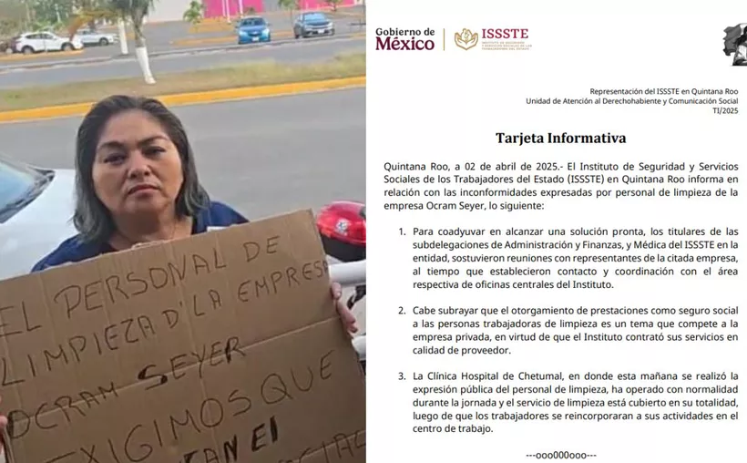 El Instituto de Seguridad y Servicios Sociales de los Trabajadores del Estado (ISSSTE) en Quintana Roo ha respondido a las recientes manifestaciones del personal de limpieza de la empresa Ocram Seyer en la Clínica Hospital de Chetumal. Según un comunicado oficial, los titulares de las subdelegaciones de Administración y Finanzas, y Médica del ISSSTE en la entidad han sostenido reuniones con representantes de la empresa proveedora del servicio de limpieza, además de establecer contacto con las oficinas centrales del Instituto para dar seguimiento al caso.
