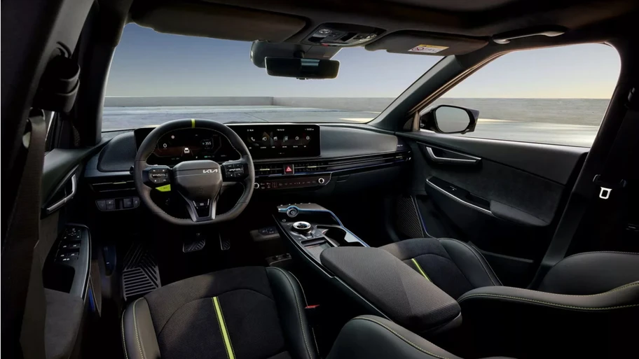 En el interior, el EV6 GT 2026 ofrece una atmósfera deportiva y tecnológica. Los asientos deportivos con ajuste eléctrico están revestidos en una combinación de piel sintética y alcántara, con acentos en color verde lima que resaltan el dinamismo del habitáculo. El vehículo cuenta con dos pantallas curvas de 12.3 pulgadas que integran el sistema de infoentretenimiento y el cuadro de instrumentos, proporcionando una experiencia digital avanzada. Un nuevo volante y una amplia gama de asistencias a la conducción y opciones de conectividad completan el equipamiento interior.