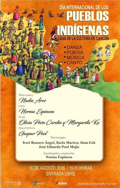 CANCÚN, Quintana Roo, 4 de agosto.— Como parte de la agenda de actividades para el mes de agosto, el Gobierno de Quintana Roo, por conducto de la Secretaría de Educación y Cultura (SEyC), conmemora el “Día Internacional de los Pueblos Indígenas”, este 9 de agosto, con la proyección de “Documentales”, en tanto que para el día 16 se han programado actividades de danza, poesía, música y canto en la Casa de la Cultura de Cancún.