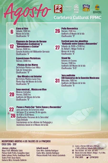 COZUMEL, Quintana Roo, 2 de agosto.— La Fundación de Parques y Museos de Cozumel en Quintana Roo (FPMC) anunció su programación cultural para el mes de agosto y la apertura de las inscripciones para sus talleres del ciclo 2016-2017.