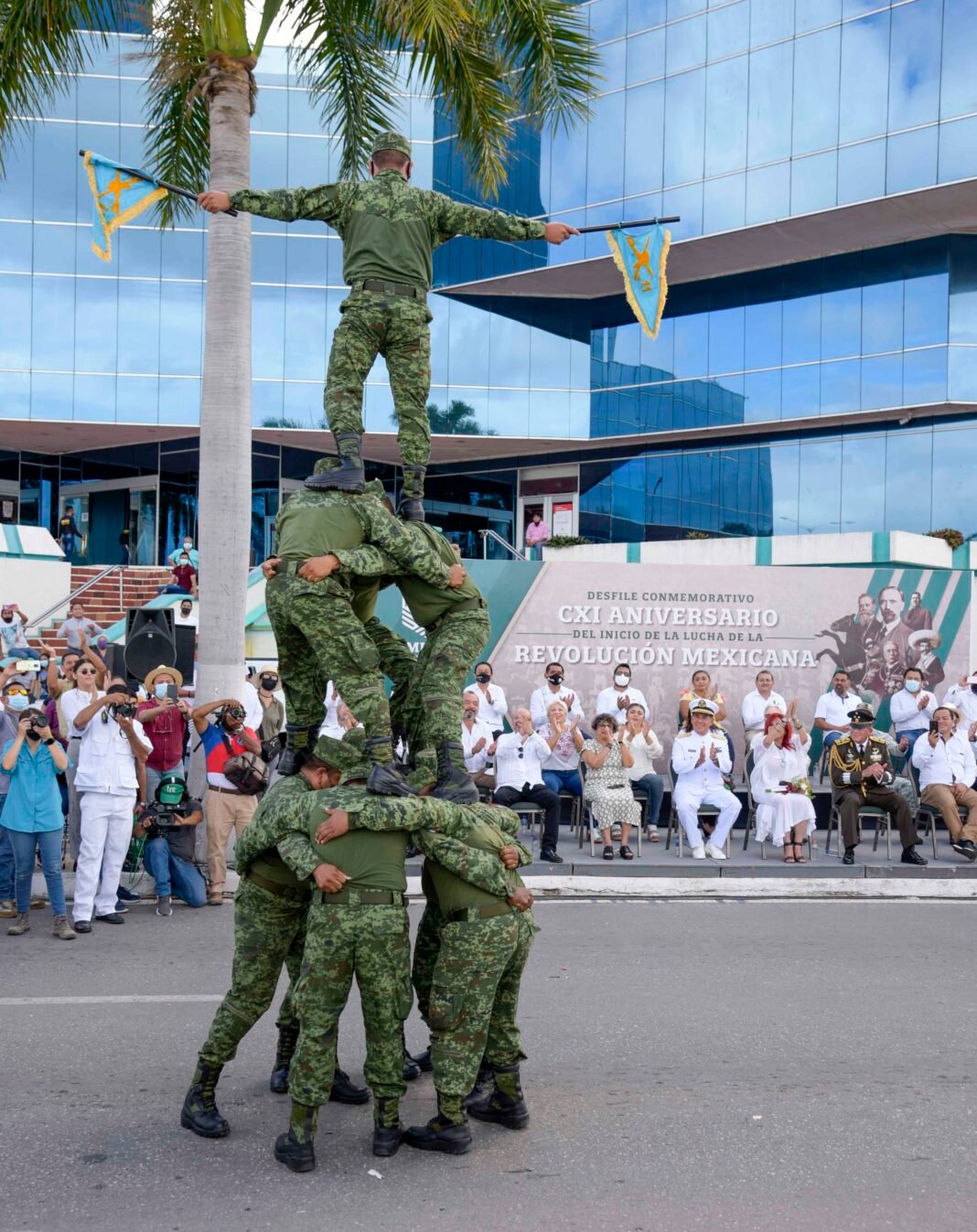 Más de mil personas realizaron diversas acrobacias, exhibiciones y rutinas para disfrute de cientos de familias campechanas y visitantes durante el desfile conmemorativo del CXI aniversario del inicio de la Revolución Mexicana, que presidió la gobernadora Layda Sansores San Román, en el que entregó reconocimientos a los ganadores del Premio Estatal del Deporte y Mérito Deportivo de Campeche 2021.
