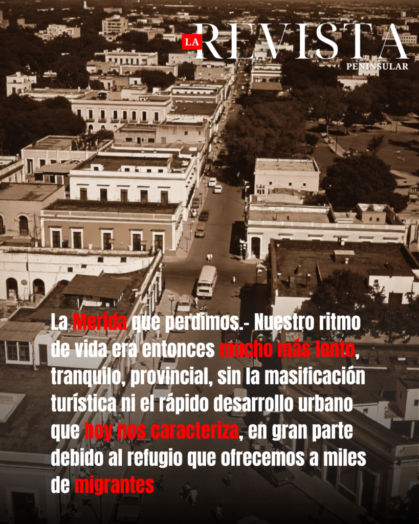 Con sus 420,000 habitantes, nuestro entorno urbano y nuestro paisaje eran muy diferentes. Llevábamos una vida propia en torno a la paz y la tranquilidad, con costumbres y entretenimientos muy nuestros. Todavía transitábamos por el centro y algunos barrios sobre calles empedradas, unas con adocretos rojos que nos llegaban de Europa como lastre en los barcos que transportaban la fibra del henequén.