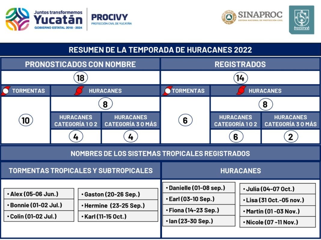Mérida, Yucatán, 28 de noviembre de 2022.- Este 30 de noviembre, finaliza la temporada de huracanes en el Atlántico, Mar Caribe y Golfo de México, y la Coordinación Estatal de Protección Civil (Procivy) aseguró que se ha fortalecido la capacidad de respuesta para minimizar los efectos de estos fenómenos.