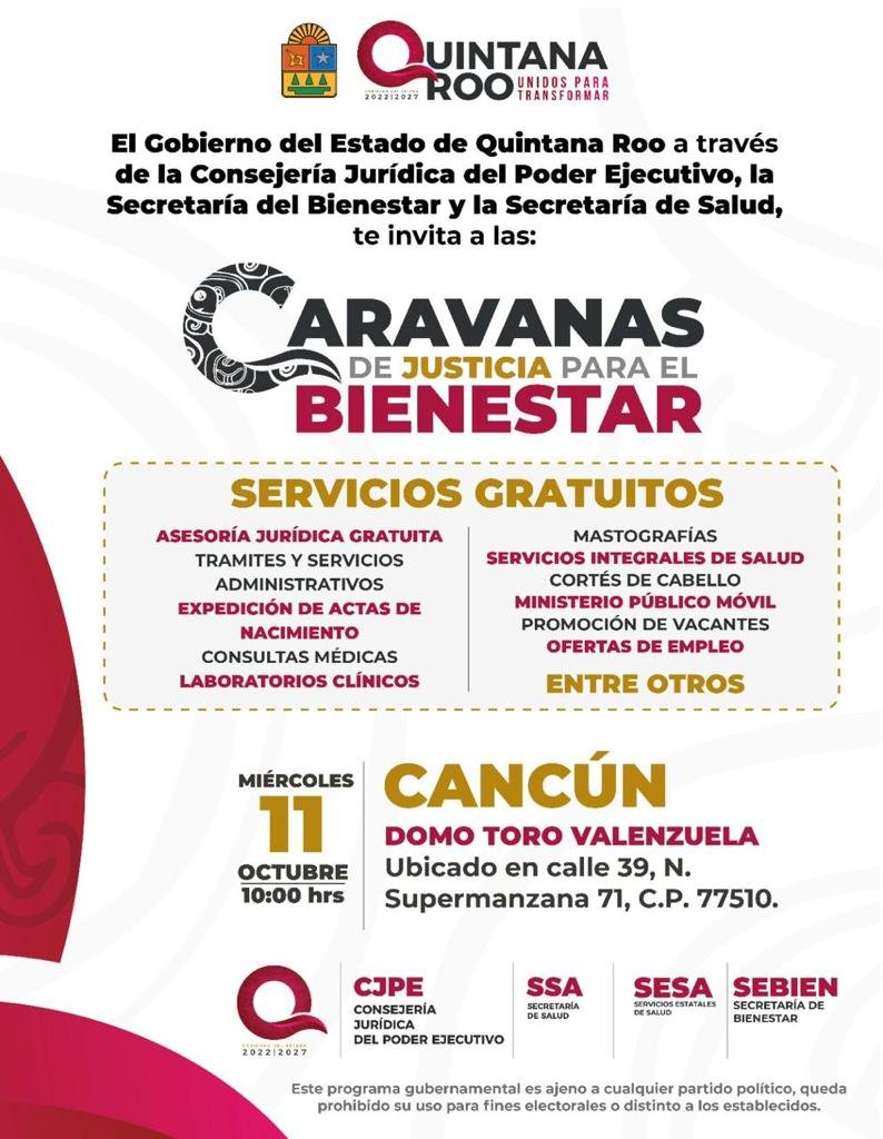 Cancún, Q. R., a 09 de octubre de 2023.- En unidad con el gobierno de Quintana Roo, Ayuntamiento de Benito Juárez, invita a las y los cancunenses a las “Caravanas de Justicia para el Bienestar”, que se instalarán este miércoles 11 de octubre en las instalaciones del Domo Toro Valenzuela, ubicado en la calle 39 de la Supermanzana 71, acercando a partir de las 10:00 horas diversos servicios gratuitos a la ciudadanía.