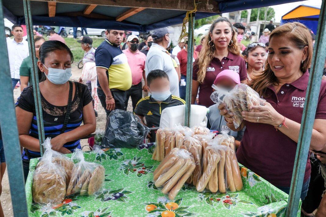 También, entre porras y consignas como “¡Mara gobernadora!”, saludó a comerciantes del tianguis, en el que un centenar de vendedores, 70 por ciento mujeres, ofrece plantas, frutas y verduras, pollo fresco, ropa, artículos de belleza, antojitos yucatecos, juguetes, zapatos y herramientas, a quienes ofreció coordinación con la autoridad municipal para que tengan un espacio más adecuado para su actividad, como un bazar.