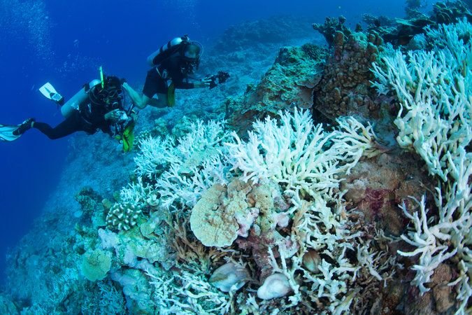 Un cuarto de las emisiones a la atmósfera de CO2 acaban siendo absorbidas por los océanos. Esto está provocando un aumento en la acidificación de las aguas, lo que a su vez hace descender los niveles de pH y debilita a las estructuras de carbonato de calcio que forman el esqueleto de los corales. Estas estructuras vivas propias de los trópicos, que son la piedra angular de unos ecosistemas complejos, diversos y de una belleza deslumbrante, están por tanto en peligro en todas las partes del mundo. Aquí y allá los científicos portan malas noticias cuando se sumergen en arrecifes que antaño florecían de vida y color, y que hoy muestran montañas de corales blanqueados por la muerte y abandonados por sus moradores.