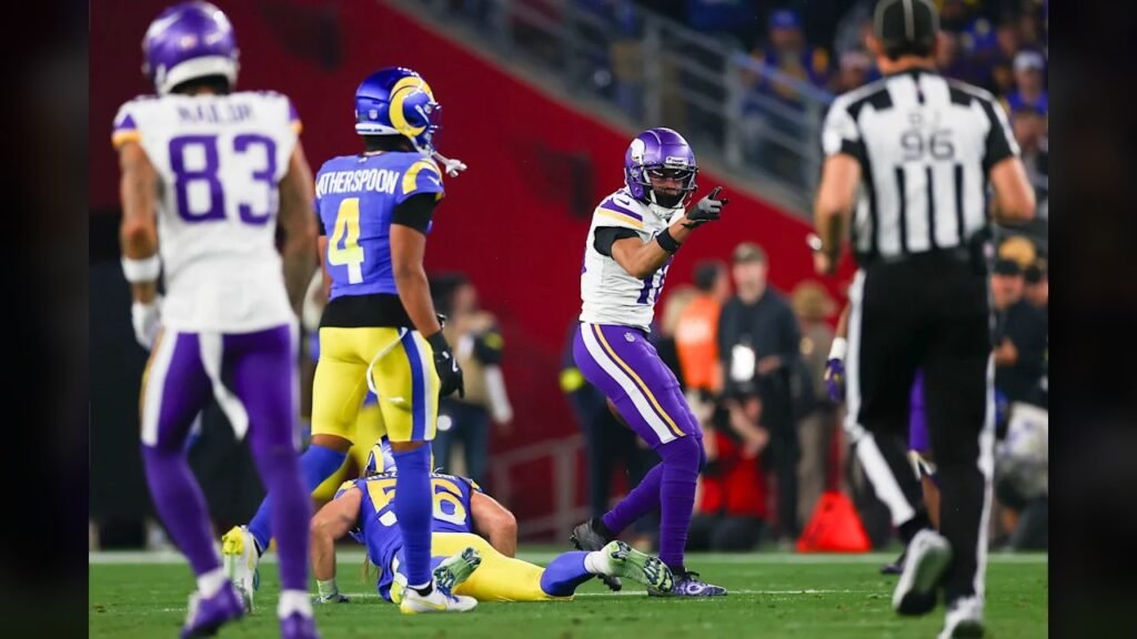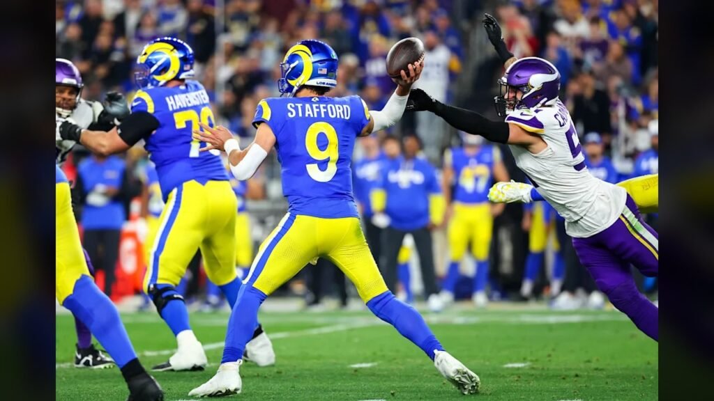 Desde el inicio del encuentro, los Rams dejaron claras sus intenciones. En el primer cuarto, un pase de Stafford hacia Kyren Williams y un gol de campo los colocaron al frente 10-0. Aunque los Vikings intentaron reaccionar al inicio del segundo cuarto con un gol de campo que los acercó 10-3, la defensa de Los Angeles rápidamente apagó cualquier esperanza. Ahkello Witherspoon logró un golpe decisivo sobre Sam Darnold, provocando un balón suelto que Jared Verse recuperó y convirtió en un touchdown, ampliando la ventaja a 17-3.