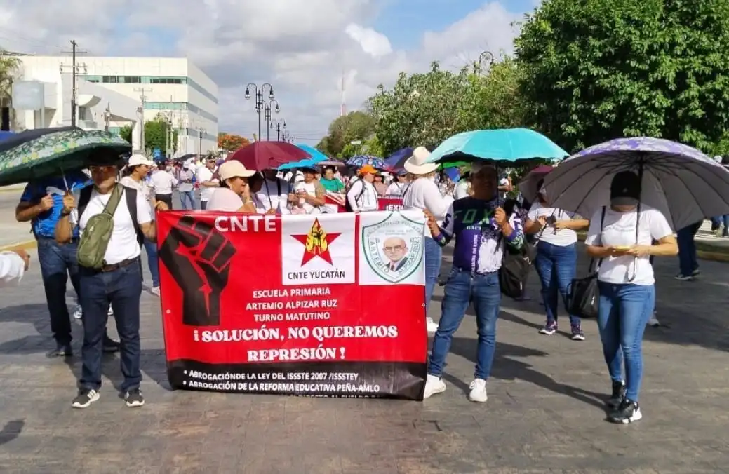Este miércoles 28 de mayo de 2025, docentes afiliados a la Coordinadora Nacional de Trabajadores de la Educación (CNTE) se manifestaron en Mérida, Yucatán, exigiendo la derogación de la Ley del ISSSTE de 2007 y mejores condiciones laborales. La protesta incluyó una marcha desde el parque de La Paz hasta el Palacio de Gobierno, causando cierres viales en el centro de la ciudad.