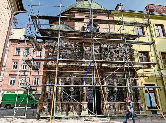 Protección en la capilla de Boim, en el centro de la ciudad de Leópolis, patrimonio mundial de la Unesco. Foto: EFE