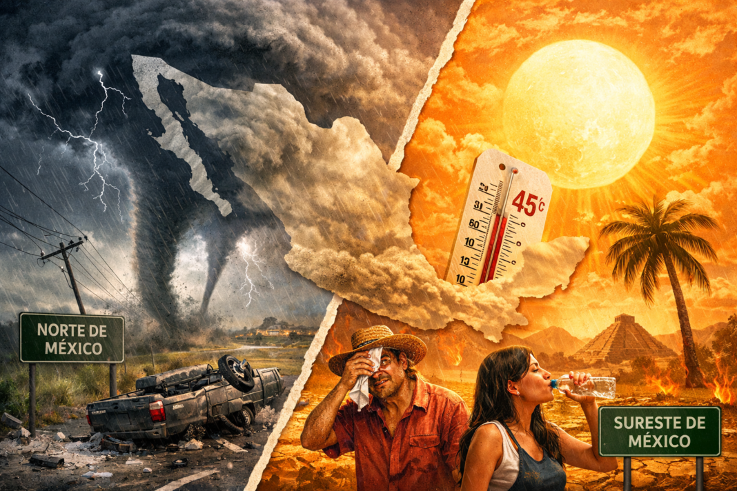 México enfrenta un escenario meteorológico de contrastes extremos debido a la interacción del Frente Frío 43 y una persistente onda de calor. Mientras los estados del norte —Coahuila, Nuevo León y Tamaulipas— se mantienen en alerta máxima por la probable formación de tornados y tormentas eléctricas severas, el sur y el sureste del país experimentan temperaturas asfixiantes que alcanzan los 45°C.