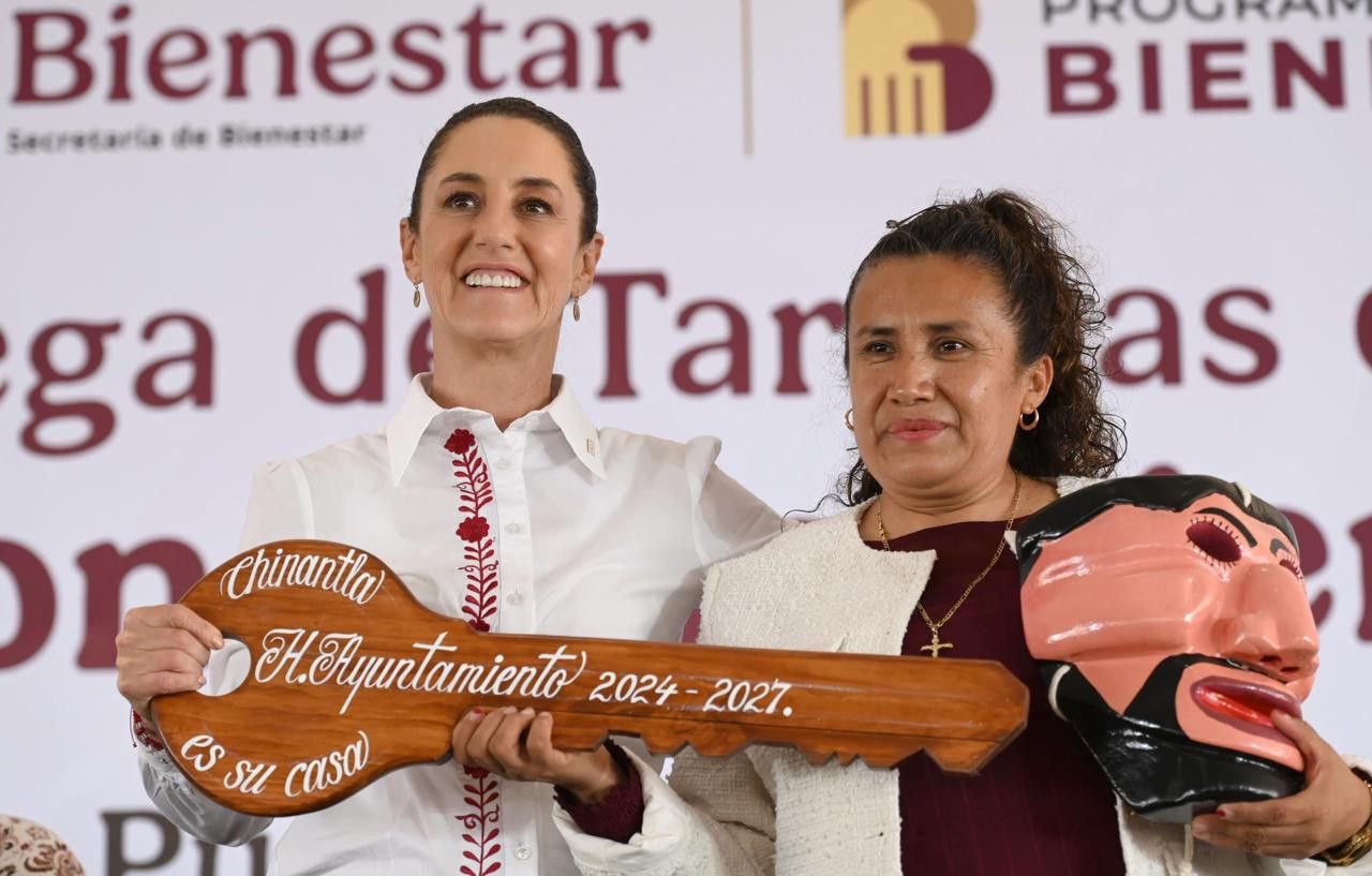 La Jefa del Ejecutivo Federal encabezó en Chinantla la entrega de 175 tarjetas del Banco del Bienestar a beneficiarias de la Pensión Mujeres Bienestar, apoyo que en todo el estado de Puebla se otorgará a 45 mil 818 mujeres de 63 y 64 años; así como de 270 tarjetas para la Pensión para el Bienestar de las Personas Adultas Mayores que a nivel estatal será entregado en 2025 a 32 mil 360 personas de 65 años y más; apoyos que, aseguró, son un derecho del pueblo de México, al igual que la educación y la salud.