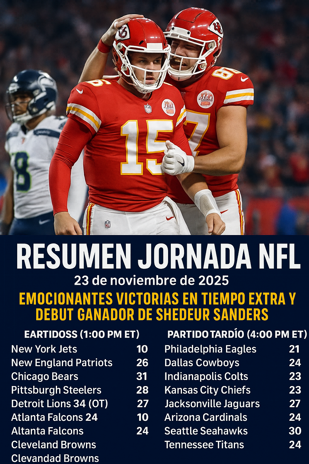 Esta jornada deja a equipos como los Chiefs y Lions fortalecidos en sus divisiones, mientras que los Giants enfrentan una reconstrucción. El debut de Sanders añade un nuevo capítulo emocionante a la temporada 2025. ¡Sigue atento a las próximas semanas, ya que la carrera por los playoffs se intensifica!