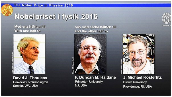 El premio Nobel de Física fue concedido este martes (4.10.2016) a David J. Thouless, por un lado, y a Duncan Haldane y Michael Kosterlitz, por el otro, todos ellos miembros de universidades estadounidenses, por los descubrimientos teóricos de las transiciones en fases y las fases topológicas de la materia.