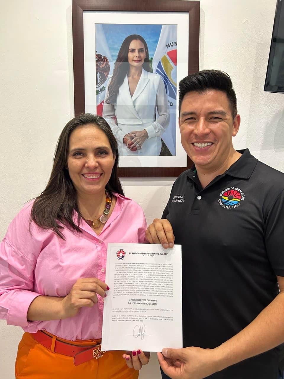 Cancún, Q. R., a 19 de julio de 2023.- Por instrucciones de la Presidenta Municipal, Ana Patricia Peralta, el Ayuntamiento de Benito Juárez, a través de la secretaria particular, Berenice Polanco Córdova, hizo el nombramiento oficial de Ricardo Reyes Quintero, como nuevo director de Gestión Social, ocupando el cargo que tuvo la actual secretaria municipal de Desarrollo Social y Económico, Berenice Sosa Osorio.