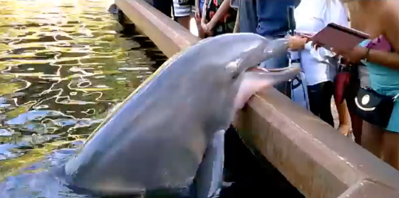 “Como pueden ver, los delfines pueden agarrar sus artículos sueltos”, advierte luego una empleada del parque por el altavoz.