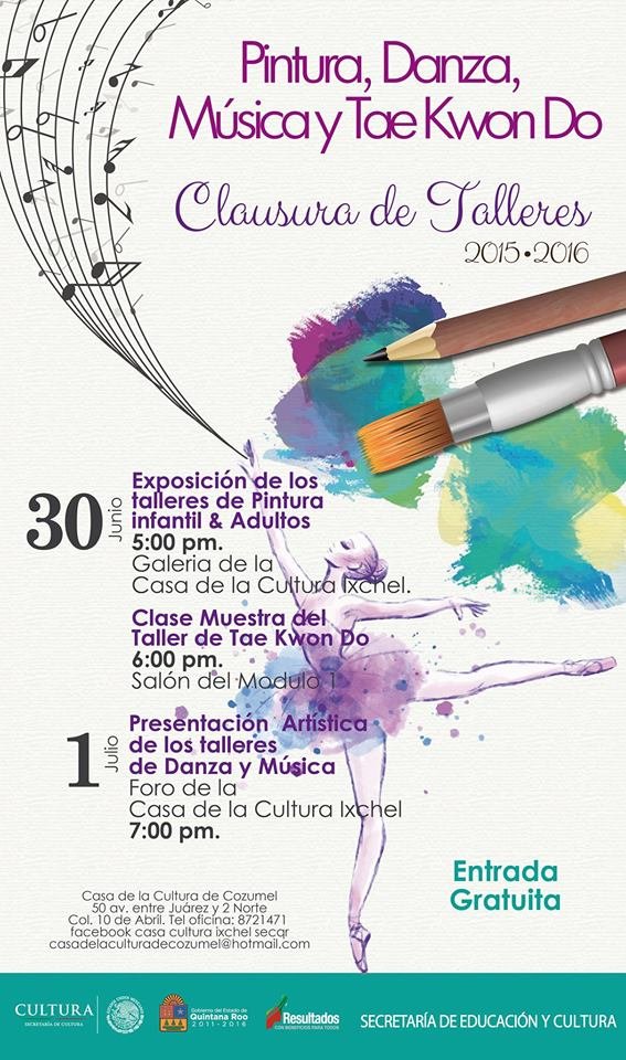 COZUMEL, Quintana Roo, 29 de junio.— El Gobierno de Quintana Roo, por conducto de la Secretaría de Educación y Cultura (SEyC), llevará al cabo la clausura de sus 19 talleres del ciclo 2015-2016 impartidos en la Casa de la Cultura Ixchel de Cozumel, y que fueron aprovechados por más de 90 alumnos de todas las edades en 10 disciplinas.