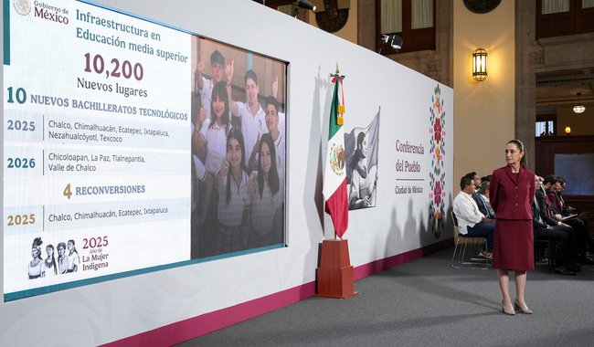 El secretario de Educación Pública, Mario Delgado Carrillo, informó que se crearán 10 mil 200 nuevos lugares en Educación Media Superior, con 10 nuevos bachilleratos tecnológicos y 4 reconversiones de secundarias, cuyo turno vespertino se utilizará para preparatorias, a través de una inversión de 3 mil mdp. Además, la secretaria de Ciencia, Humanidades, Tecnología e Innovación, Rosaura Ruiz Gutiérrez, anunció que se creará una universidad en cada municipio, ya sea de la Universidad Nacional Rosario Castellanos (UNRC) o de las Universidades para el Bienestar Benito Juárez García. Y a partir del 8 de septiembre inician actividades dos unidades de la UNRC en Chalco y Chimalhuacán y una Unidad a Distancia.