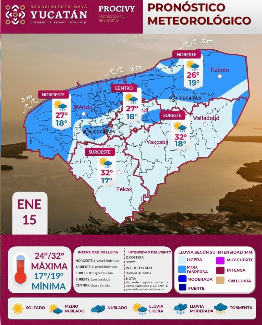 Las autoridades meteorológicas nacionales y estatales emitieron un nuevo pronóstico climático que ubica sobre la Península de Yucatán el avance del frente frío número 28, lo que está generando un significativo cambio en las condiciones del tiempo en la región. Según el Servicio Meteorológico Nacional de la Comisión Nacional del Agua, este sistema frontal y su masa de aire polar asociada se desplazan rápidamente sobre el sureste del país, con efectos directos en las condiciones atmosféricas de Yucatán, donde se espera un descenso de las temperaturas acompañado de lluvias de intensidad ligera a moderada. El organismo nacional detalló que el frente frío interactúa con una vaguada en altura y un canal de baja presión sobre el Golfo de México, lo que ha favorecido la presencia de intervalos de chubascos en distintas zonas de la península y un cambio en el régimen térmico tras días de estabilidad relativa. Las rachas de viento serán un componente destacado de este fenómeno meteorológico, con velocidades estimadas de 50 a 60 kilómetros por hora en las zonas costeras y de 30 a 40 kilómetros por hora en el interior del estado de Yucatán, lo que se traduce en un evento de “norte” que afectará la navegación y actividades marinas, con oleaje que podría alcanzar alturas de hasta tres metros en áreas marítimas. La coordinación estatal de Protección Civil en Yucatán ha subrayado la necesidad de que la población y los sectores productivos tomen previsiones frente a estos cambios meteorológicos. Las lluvias ligeras a moderadas se esperan principalmente en municipios del noreste y noroeste del estado, incluido Mérida, mientras que en las regiones del centro, sureste y suroeste las precipitaciones serán de carácter aislado por la tarde, con posibilidades de chubascos dispersos que podrían afectar actividades al aire libre. En cuanto a las temperaturas, el ingreso del frente frío y la masa de aire polar asociada provocarán un enfriamiento generalizado, en especial durante las primeras horas del día, con valores mínimos más bajos de lo registrado en jornadas previas y con máximas que podrían mantenerse entre los 24 y 32 grados centígrados en distintos puntos del estado. El pronóstico extendido indica que esta condición de descenso térmico y probabilidad de lluvia persistirá por lo menos durante las próximas 24 a 48 horas mientras el frente frío se desplaza y pierde intensidad hacia el sureste de la República, aunque se mantiene la posibilidad de que otras masas de aire frío adicionales sigan influyendo en la región en los días siguientes. Las advertencias de las autoridades climatológicas incluyen recomendaciones específicas para la población, entre ellas mantenerse informada sobre cambios en el pronóstico, precaución en zonas costeras por los vientos fuertes y oleaje alto, así como atención a posibles heladas o condiciones de mayor frío durante las madrugadas más frías de este periodo de transición. La evolución de este sistema frontal se da en un contexto de temporada invernal en México en la que múltiples frentes fríos han recorrido gradualmente el territorio nacional, desde el norte hasta el sureste, afectando diversas regiones con lluvia, vientos y cambios térmicos. En este sentido, las autoridades reiteran la importancia de estar atentos a las actualizaciones del pronóstico meteorológico y a los avisos de Protección Civil para mitigar los posibles impactos de estas condiciones climáticas adversas.