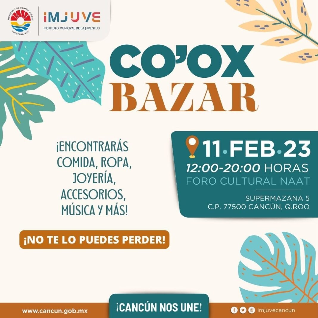 Cancún, Q.R., a 07 de febrero de 2023.- Con el fin de apoyar a las y los jóvenes cancunenses en sus emprendimientos, el Instituto Municipal de la Juventud (IMJUVE) invita a los ciudadanos a participar en la primera edición del “Co’ox Bazar”, que es un programa de emprendedores juvenil a realizarse el próximo sábado 11 de febrero en el “Foro Cultural Naat”, ubicado en la Supermanzana 5, entre las avenidas Nader y Tulum.