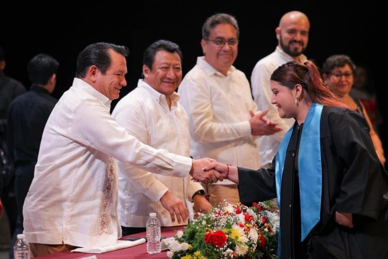 En el acto, realizado en el teatro Armando Manzanero, el mandatario estatal felicitó a las y los egresados, así como a sus familias, por alcanzar esta meta que es resultado de su disciplina, esfuerzo y constancia.