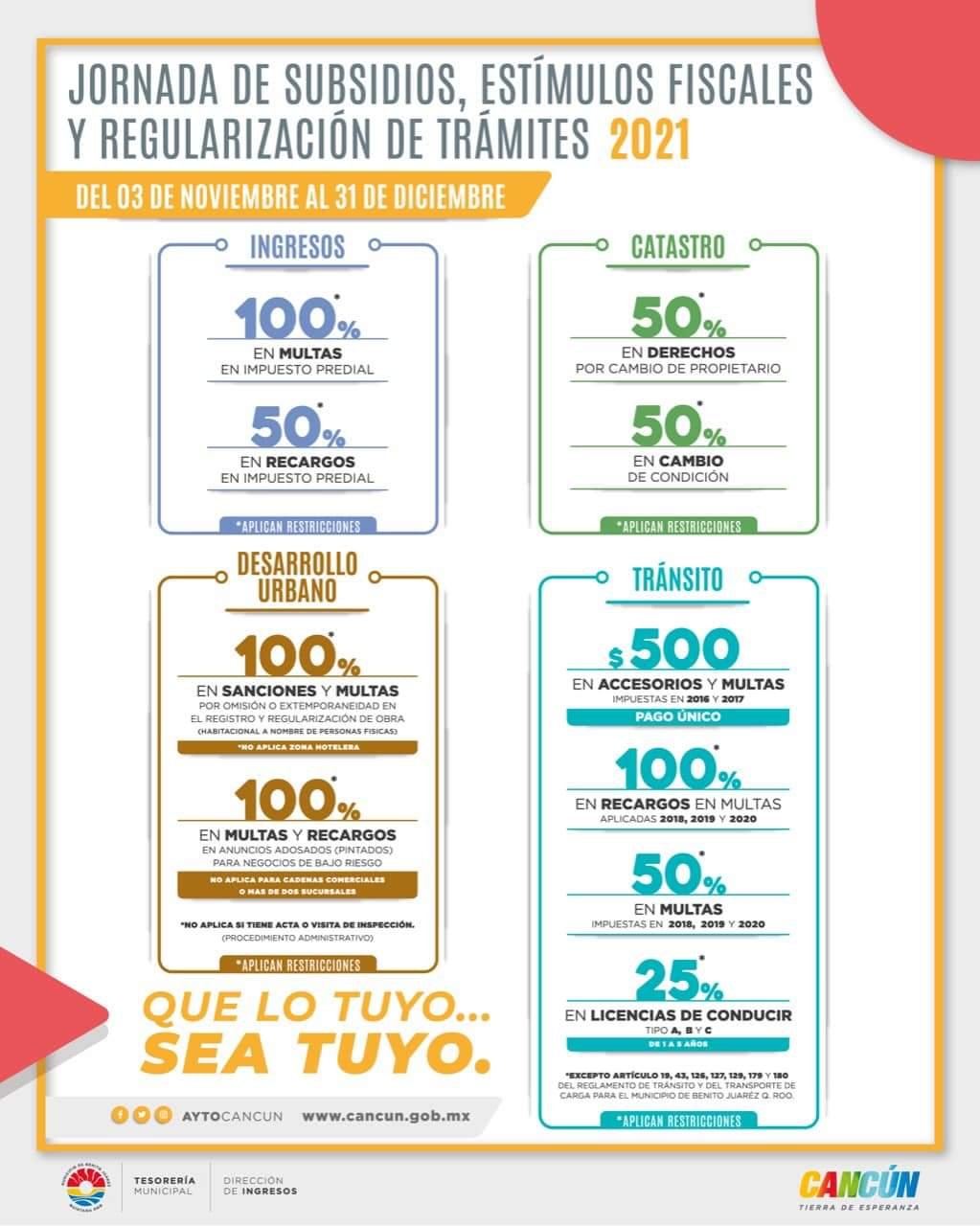 Cancún, Q.R., a 04 de noviembre de 2021.- El Ayuntamiento de Benito Juárez realiza la Jornada de Subsidios, Estímulos Fiscales y Regularización de Trámites 2021, desde el 3 de noviembre al 31 de diciembre, la primera estrategia de este tipo que corresponde a la administración 2021-2024 y que incluye la participación de cuatro dependencias municipales con diferentes apoyos.
