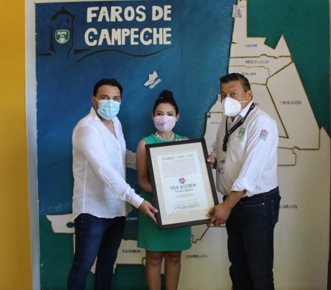 En representación del director general de la Administración Portuaria Integral de Campeche (APICAM), Carlos Eduardo Ortiz Piñero, el gerente en Carmen, Gonzalo Hernández Pérez y el encargado del Complejo Turístico del Faro Antiguo, Eneas Guzmán Constantino, recibieron el nombramiento que obtuvo Isla Aguada como “Pueblo Mágico” de manos de la coordinadora de Turismo municipal, Lilián Esther Bojórquez González, el cual formará parte de los objetos valiosos e históricos que se exhiben en el museo de esta localidad, perteneciente al Municipio de Carmen.