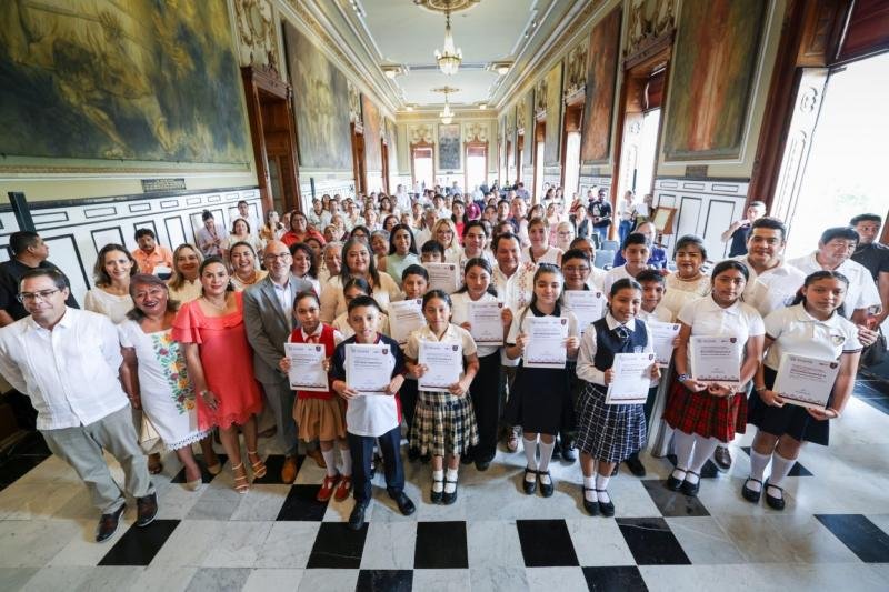 Desde el Salón de la Historia del Palacio de Gobierno, el Gobernador Joaquín Díaz Mena encabezó la ceremonia de premiación a las niñas y los niños distinguidos por su dedicación y disciplina, y felicitó tanto a ellos como a sus docentes y familias por el acompañamiento y apoyo brindado.