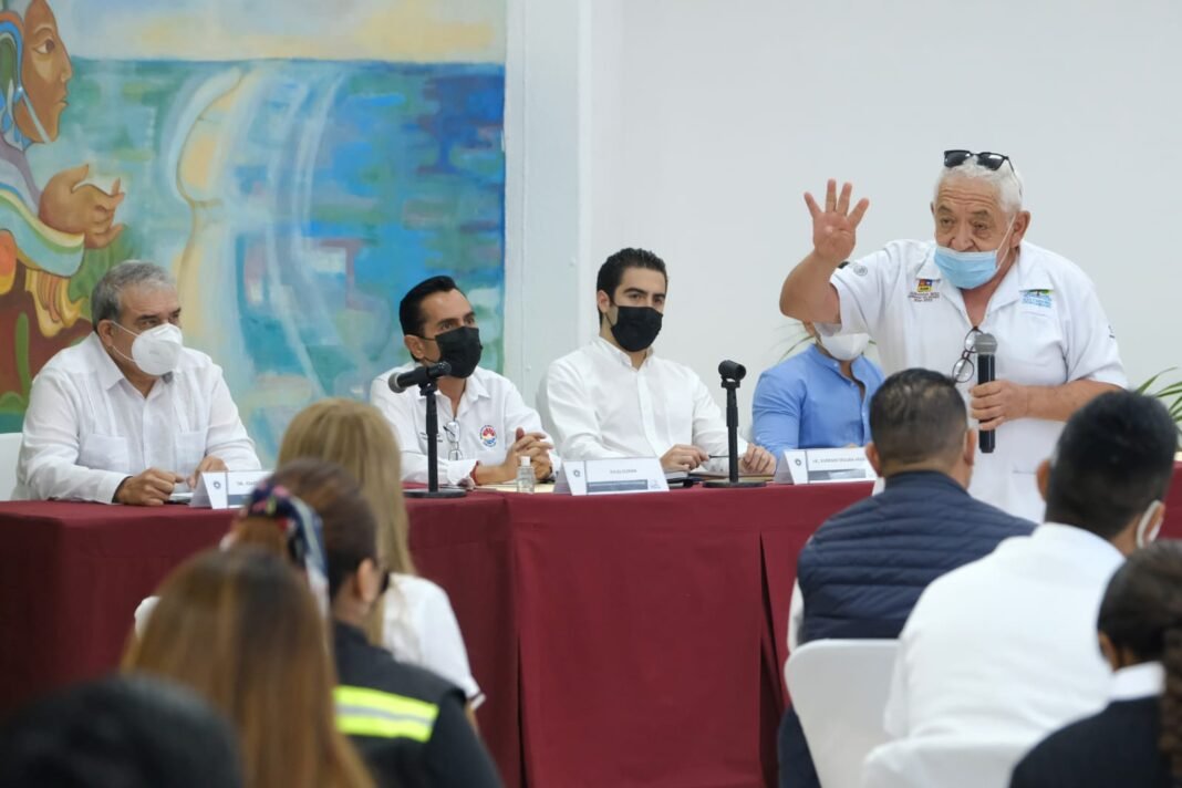 Cancún, Q.R., a 06 de enero de 2022.- Autoridades del Ayuntamiento de Benito Juárez sostuvieron una reunión de trabajo con representantes del sector salud y gobierno estatal, con el fin de redoblar acciones que permitan hacerle frente a la pandemia de COVID-19 en el municipio, además de recordar a la población no bajar la guardia en protocolos y medidas sanitarias para bien de las familias.