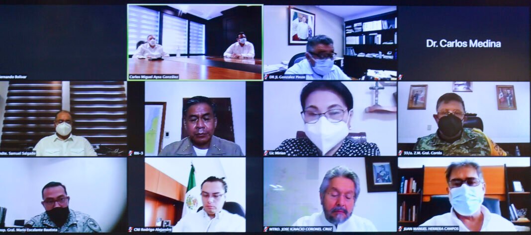 No confiarse y respetar las recomendaciones de la Secretaría de Salud para frenar los contagios de COVID-19, fue el llamado que hizo a la población el gobernador Carlos Miguel Aysa González tras evaluar los reportes relacionados con el coronavirus en la reunión virtual de la Mesa Estatal para la Construcción de la Paz, donde también se abordaron temas de seguridad pública. El jefe del Ejecutivo estatal, quien estuvo acompañado en su oficina por el secretario general de Gobierno, Jorge Argáez Uribe, sostuvo el enlace con funcionarios estatales, delegados federales y con autoridades de las Fuerzas Armadas y de la Guardia Nacional.