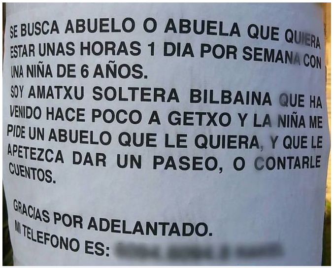“Soy madre soltera, bilbaina que ha venido hace poco a Getxo (País Vasco) y la niña me pide un abuelo que le quiera y que le apetezca dar un paseo o contarle cuentos. Gracias por adelantado”