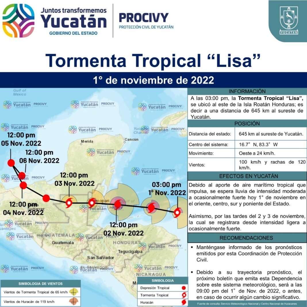 Mérida, Yucatán, 1 de noviembre de 2022.- Como medida informativa y preventiva, ante el avance en Centroamérica de la tormenta tropical Lisa, la Coordinación Estatal de Protección Civil (Procivy) informó que el Sistema Nacional de Protección Civil (Sinaproc) ha puesto la alerta azul para municipios del sur.
