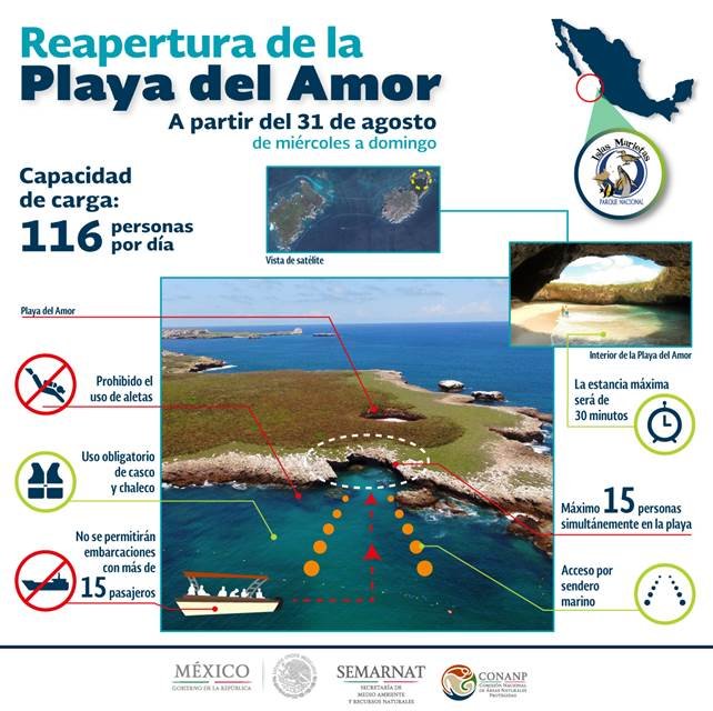 La Playa del Amor podrá ser visitada de nuevo, pero con estrictas disposiciones que eviten la afectación de los ecosistemas del Parque Nacional Islas Marietas y que permitan al visitante una experiencia de mayor calidad para poder disfrutar de este paisaje natural, y dar certidumbre a largo plazo a los prestadores de servicios turísticos de contar con un sitio único y en buen estado.