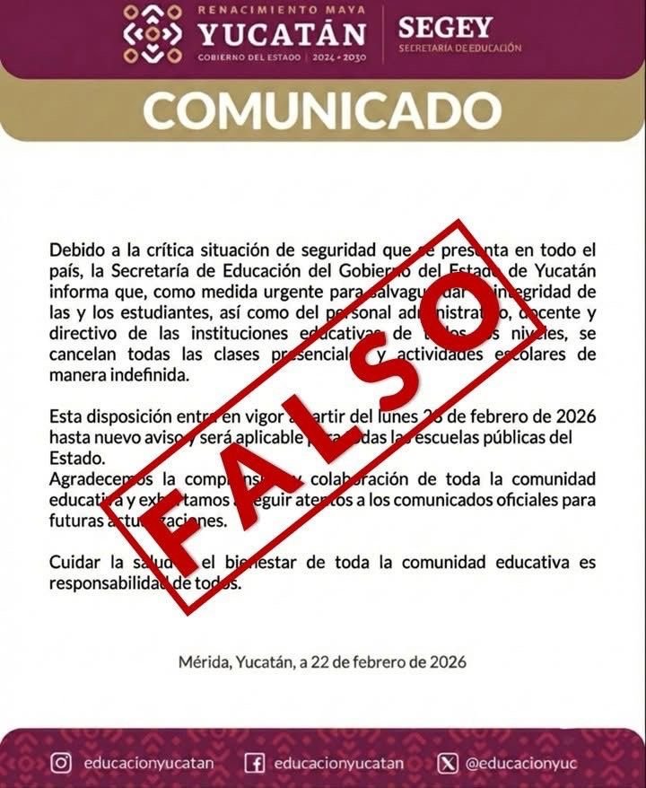 Mérida, Yucatán.– La Secretaría informó a la comunidad educativa y al público en general que es falso el comunicado que circula en redes sociales y otros medios sobre una supuesta suspensión de clases.