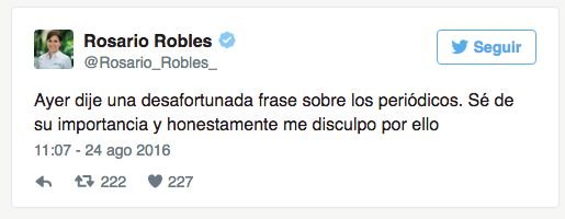 Un día después, este miércoles 24 de agosto, ella pidió perdón en su cuenta de Twitter: “Ayer dije una desafortunada frase sobre los periódicos. Sé de su importancia y honestamente me disculpo por ello”.
