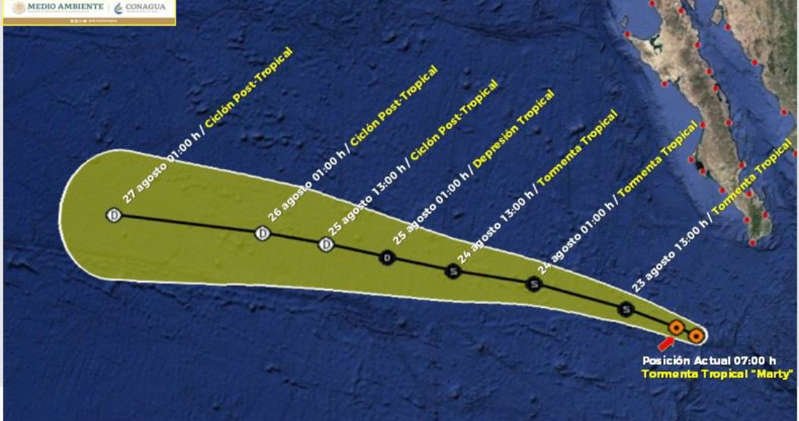 “A partir de una zona de baja presión y de remanentes de ‘Grace’ se ha desarrollado la tormenta tropical ‘Marty’ y se localiza al sur-suroeste de Cabo San Lucas, Baja California Sur, con desplazamiento hacia el oeste”, informó este lunes el Servicio Meteorológico Nacional (SMN) en un boletín.