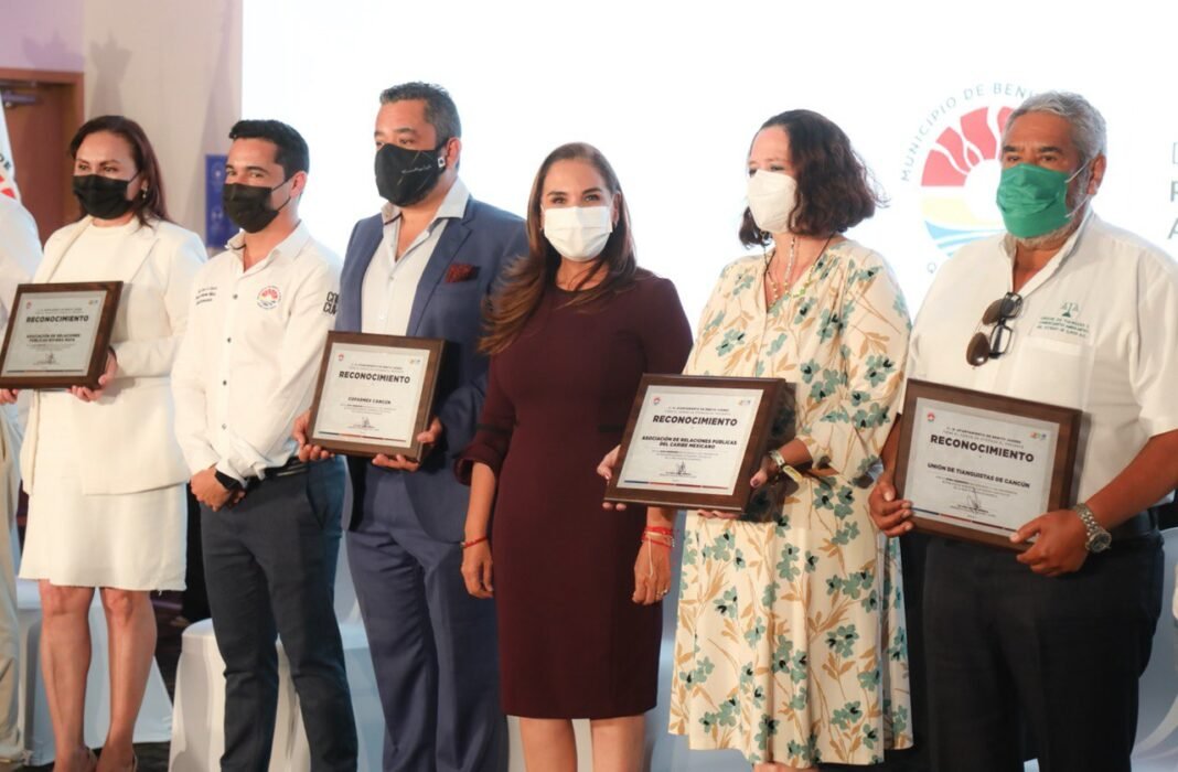 De esta forma, la Presidenta Municipal entregó las distinciones a los representantes de corporativos como Grupo Xcaret, Grupo Palace, ASUR, Ultramar, Mobility ADO, entre otros, así como a quienes dirigen las asociaciones de Hoteles de Cancún, Puerto Morelos e Isla Mujeres; de Clubes Vacacionales de Quintana Roo (Acluvaq); de Arrendadores de Vehículos de Quintana Roo; Asociados Naúticos de Quintana Roo; y Asociación Mexicana de Mujeres Empresarias (AMEXME), al igual que a la Unión de Tianguistas de Cancún.
