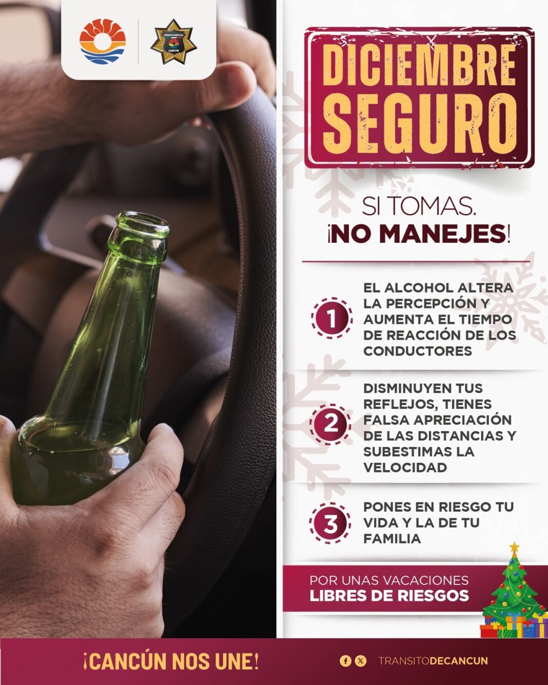 Cancún, Q. R., a 15 de diciembre de 2023.- Con el firme compromiso de resguardar la integridad física de las y los cancunenses durante las fiestas decembrinas, la Dirección de Tránsito Municipal puso en marcha la campaña “Diciembre Seguro”, para concientizar a la ciudadanía sobre no conducir si consume bebidas alcohólicas, así como hacer uso obligatorio del cinturón de seguridad para evitar accidentes trágicos.