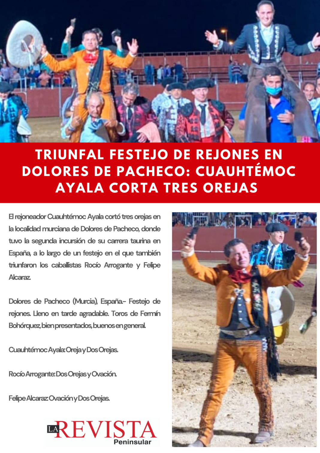 El rejoneador Cuauhtémoc Ayala cortó tres orejas en la localidad murciana de Dolores de Pacheco, donde tuvo la segunda incursión de su carrera taurina en España, a lo largo de un festejo en el que también triunfaron los caballistas Rocío Arrogante y Felipe Alcaraz.