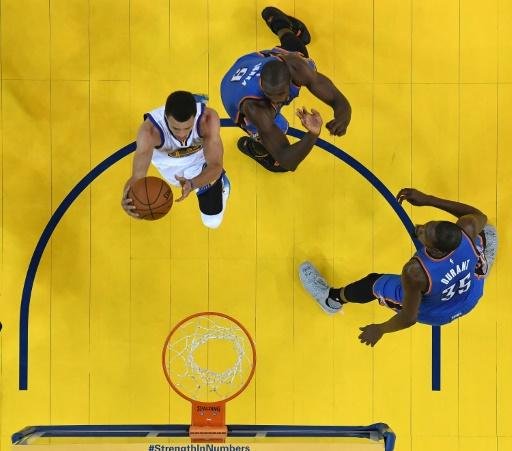 Un triple por encima de Durant de Curry puso el marcador a su favor 76-69 con siete minutos por jugar cuando Thunder se estaba metiendo de nuevo en el juego.