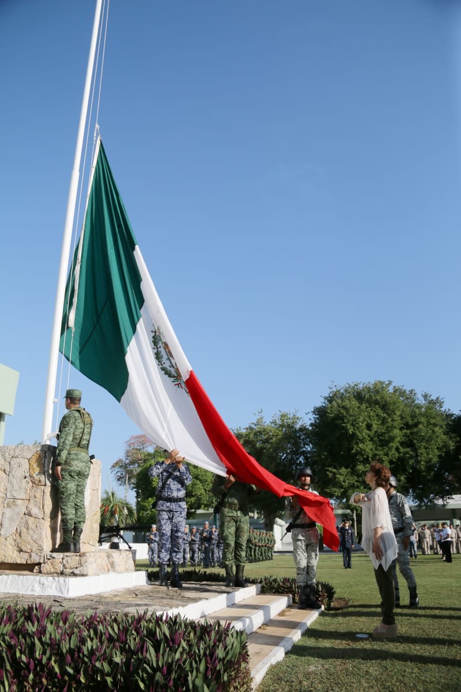 En el evento que se llevó a cabo en la Explanada “Damián Carmona” del Onceavo Batallón de Infantería de la X Región Militar, la funcionaria realizó el abanderamiento de la escolta de la escuela Primaria “Josefa Ortiz de Domínguez” de Mérida y, con ella, de manera simultánea a 40 más de igual número de planteles de los distintos niveles educativos, dos Centro de Atención Múltiple (CAM) para alumnos con discapacidad.